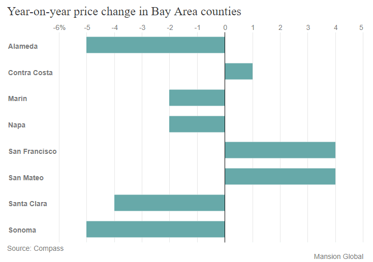 San Francisco and San Mateo were the only two areas to see prices increase, both rising 4% compared to the same quarter last year to $1.45 million and $1.47 million, respectively.