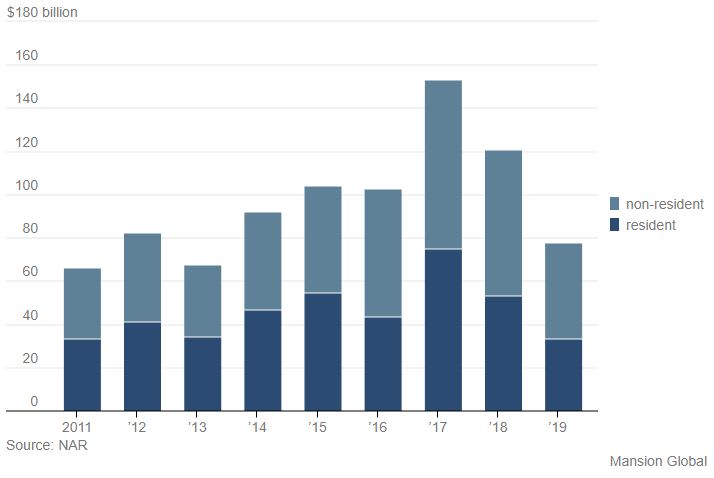 Foreigners purchased $77.9 billion-worth of existing houses in the year from April 2018 through March 2019, a 36% drop from the previous year and half the amount spent in 2017, according to an annual report released Wednesday from the National Association of Realtors.