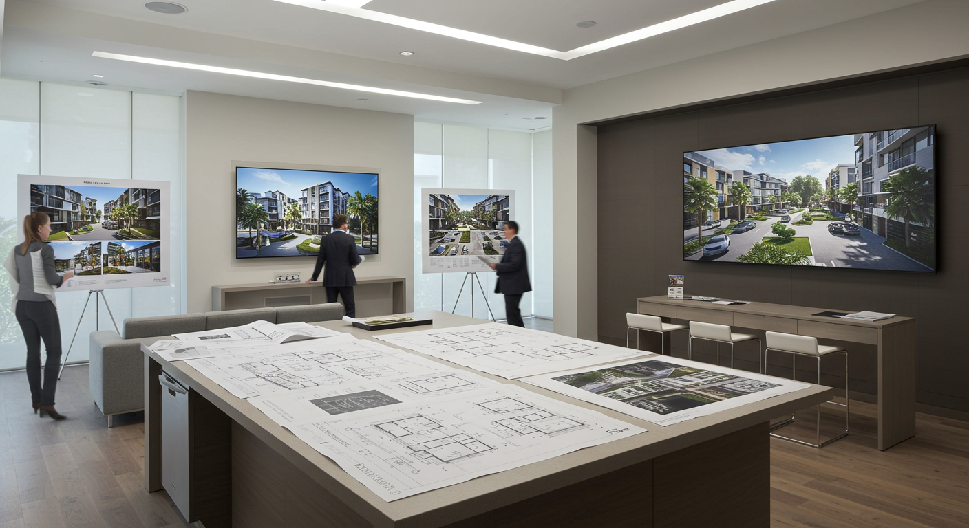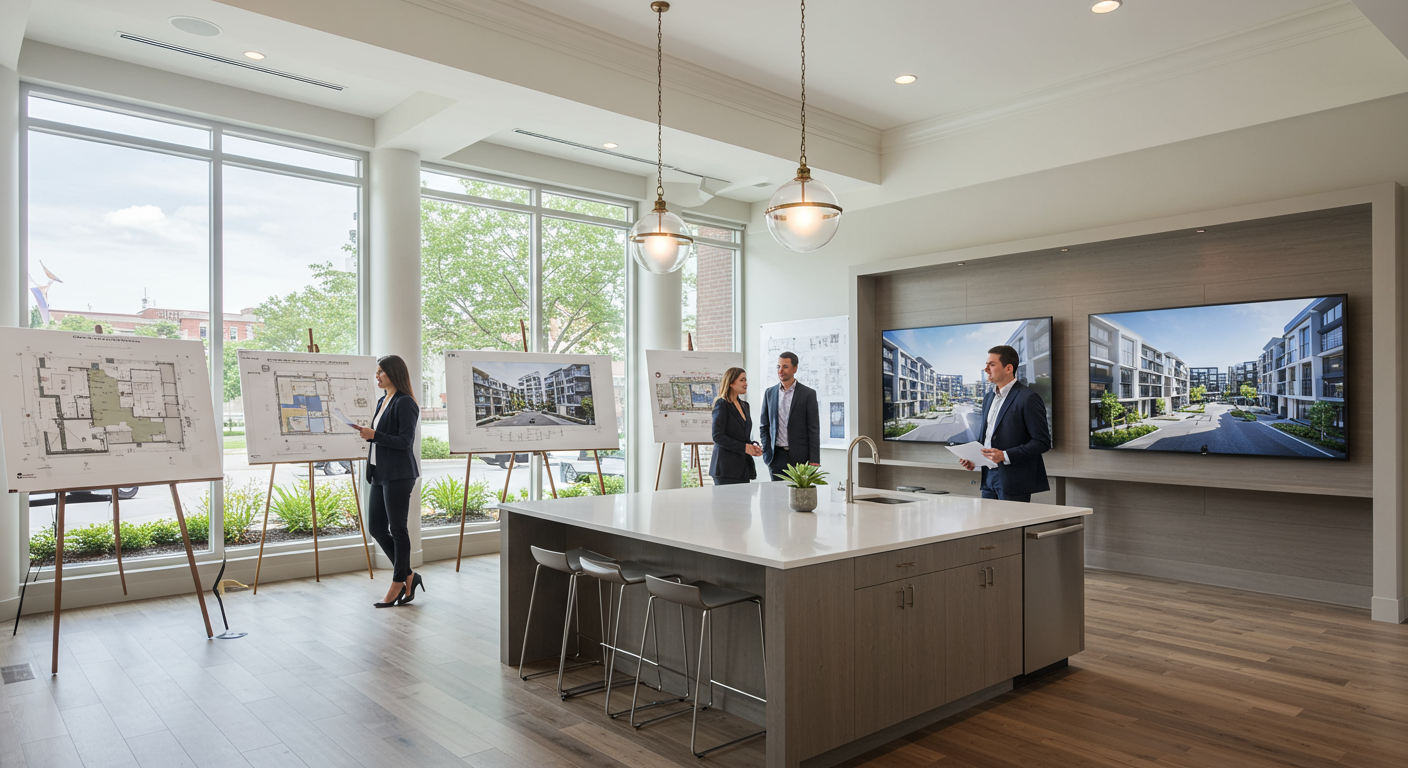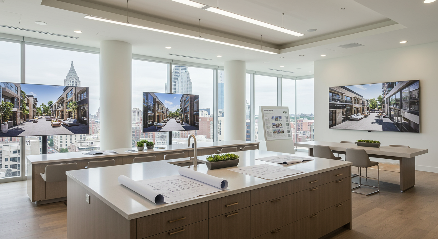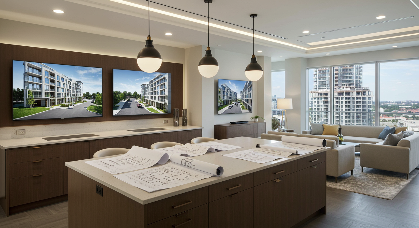 Next, guests are brought to a massive kitchen island that mimics the finishes of the completed units. Giant floor plans are rolled out across the island and two large television screens can show drone-gathered 180-degree views of every available unit.