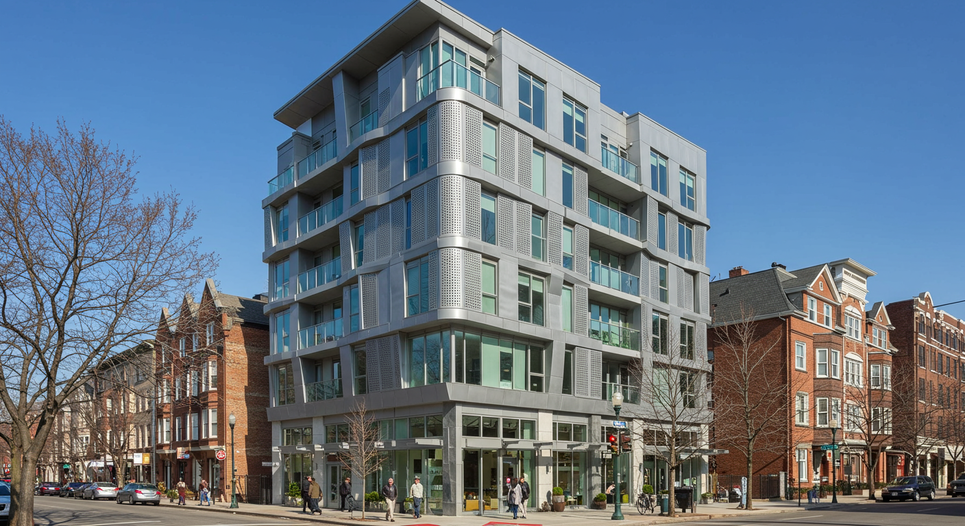 The building’s façade, made of poured-stone panels and brushed bronze, is in a timeless contemporary style that complements the rich architectural heritage of the neighborhood. Oversized, acoustically engineered windows provide solitude and allow an abundance of natural light to flow into each residence.
