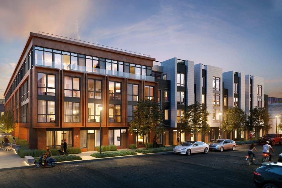 The project, which covers the width of a city block, is U-shaped and has a common open space in the form of a central courtyard. The building is broken into two divisions: One has the look of luxury residences; the other is more industrial, paying homage to the architectural style of the immediate Dogpatch Historic District.
