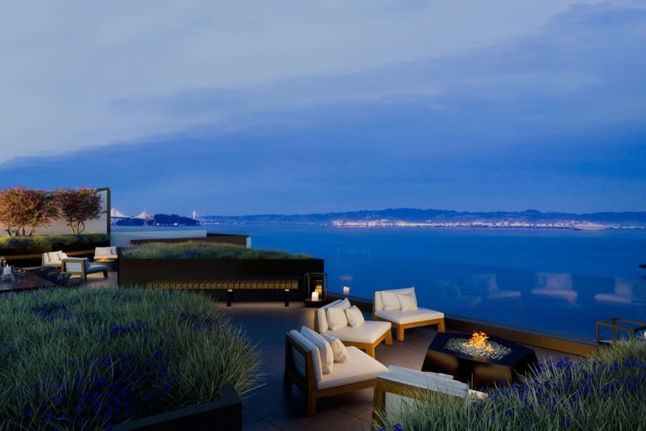 Amenities: A lobby with a concierge desk and a private sitting room with a fireplace and a dramatic floor-to-ceiling plaster art piece by Parisian craftsman Atelier Premiere; a panoramic sky lounge that has views of San Francisco Bay, the Golden Gate Bridge, the 1,500-acre Presidio park and the Marin Headlands, which is part of the Golden Gate National Recreation Area.